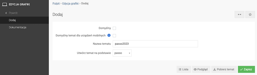 Możesz pracować na domyślnym temacie graficznym passo lub stworzyć nowy temat w panelu administracyjnym, bazujący na passo.