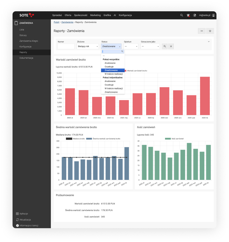 Analogiczne raporty dostępne są także dla zamówień z Allegro. Można je znaleźć w menu: Zamówienia → Raporty → Zamówienia Allegro. Dzięki temu w prosty sposób przejrzysz zamówienia pochodzące z Allegro oraz wygenerujesz wykresy dla wybranych filtrów.