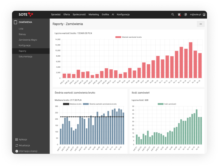 W najnowszej aktualizacji dodaliśmy funkcję raportów sprzedaży w zamówieniach. Raporty są zintegrowane z filtrami zamówień, dzięki czemu można generować je według Statusu, Wartości, Zakresów czasowych oraz wielu innych parametrów. Dodatkowo udostępniliśmy osobny raport prezentujący zestawienie sprzedaży z Allegro. Funkcja jest dostępna dla wszystkich sklepów SOTESHOP 8. Zaktualizuj swój sklep i wykorzystaj nowe możliwości.